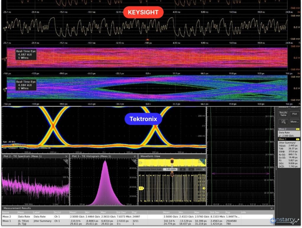 Keysight’s use of the UXR-derived acceleration engine allows the MXR-B to perform jitter analysis up to 70% faster than software-reliant platforms. For DDR5 validation, where eye-diagrams must be built from millions of unit intervals (UI), the MXR-B can process > 750,000 UI/s, achieving six-sigma statistical confidence in seconds.