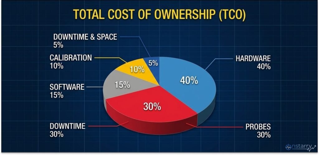 • Probing: High-performance differential probes (e.g., Keysight N2751A 3.5 GHz) cost ~$10,000 each. A full 8-channel set can double the TCO.